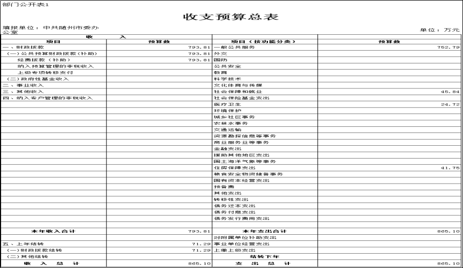 (一)收入預算安排情況:預算收入865.1萬元,比上年減少5%,其中:財政撥款(補助)793.81萬元,上年財政撥款結轉71.29萬元。