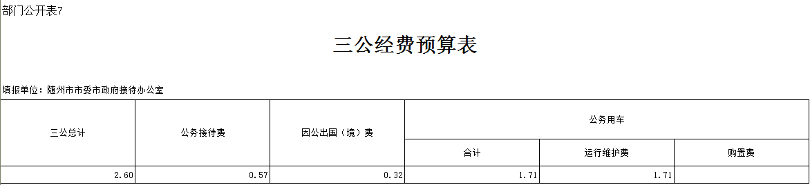 2017年隨州市委隨州市人民政府接待辦公室“三公”經費年初預算2.60萬元。其中:公務接待費0.57萬元,因公出國(境)費0.32萬元,公務用車運行維護費1.71萬元。比2016年“三公”經費6.90萬元減少4.3萬元,減少62%。減少原因:接待車運行維護費在項目經費中開支。