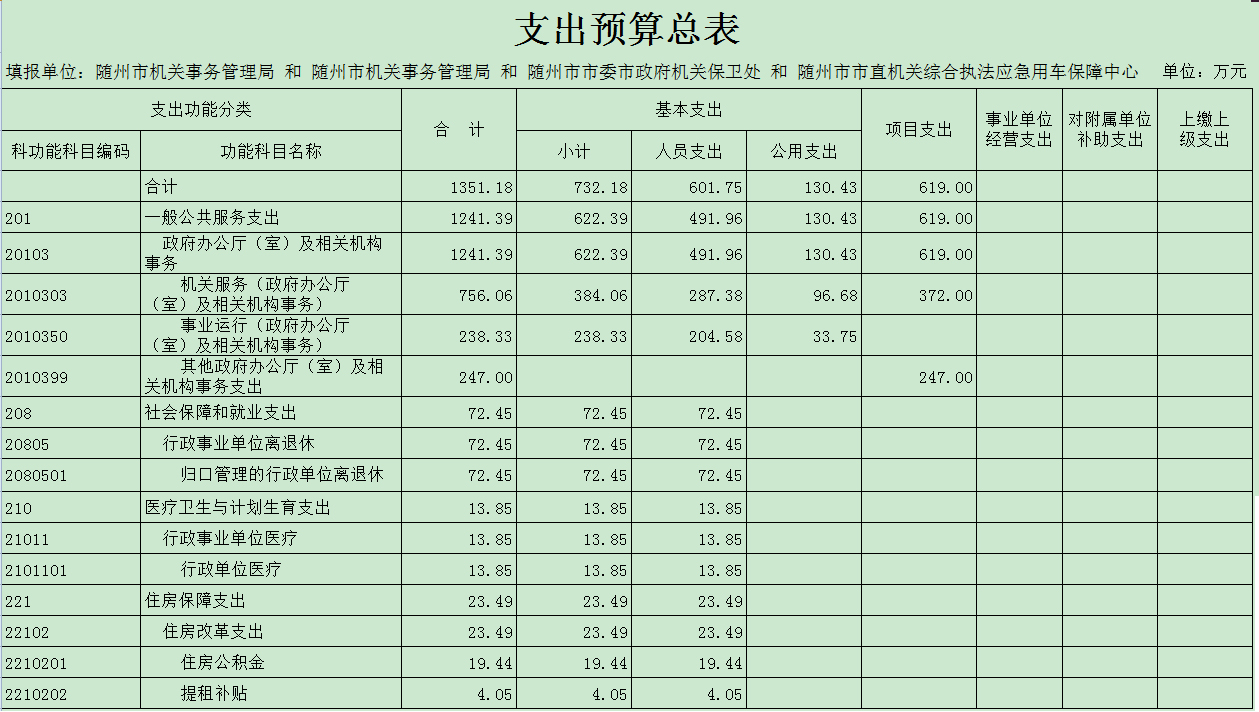 1、本部門匯總支出預算總額1351.18萬元,按功能分:基本支出732.18萬元(人員支出601.75萬元,公用支出130.43萬元),項目支出619萬元。按性質分:財政撥款安排支出1260.27萬元,其他收入安排支出53.30萬元,上年結轉安排支出37.61萬元。因本部門2016年新增二級單位1個(市直機關綜合執法應急用車保障中心),預算數據與上年無可比性。