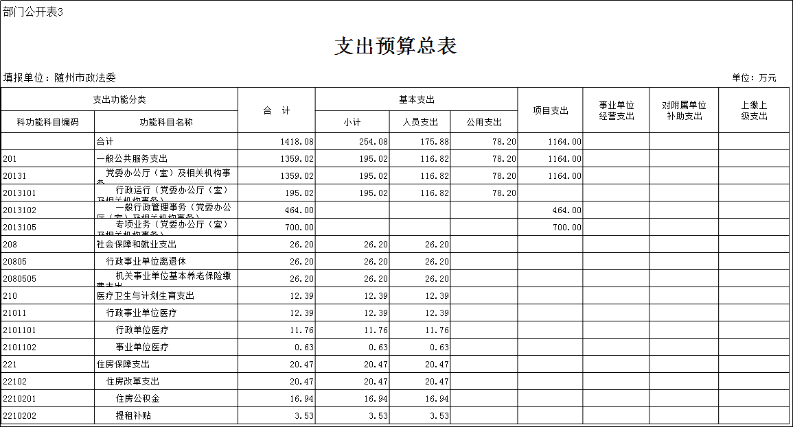2018年財政預(yù)算支出1418.08 萬元,其中,一般公共服務(wù)支出1359.02萬元,社會保障和就業(yè)支出26.2萬元,醫(yī)療衛(wèi)生支出12.39 萬元,住房保障支出20.47 萬元。比上年增加562.57萬元,同比增39.67%,主要原因是增加了新增性項目——市政法機關(guān)信息化“1234”工程建設(shè)專項經(jīng)費預(yù)算支出。
