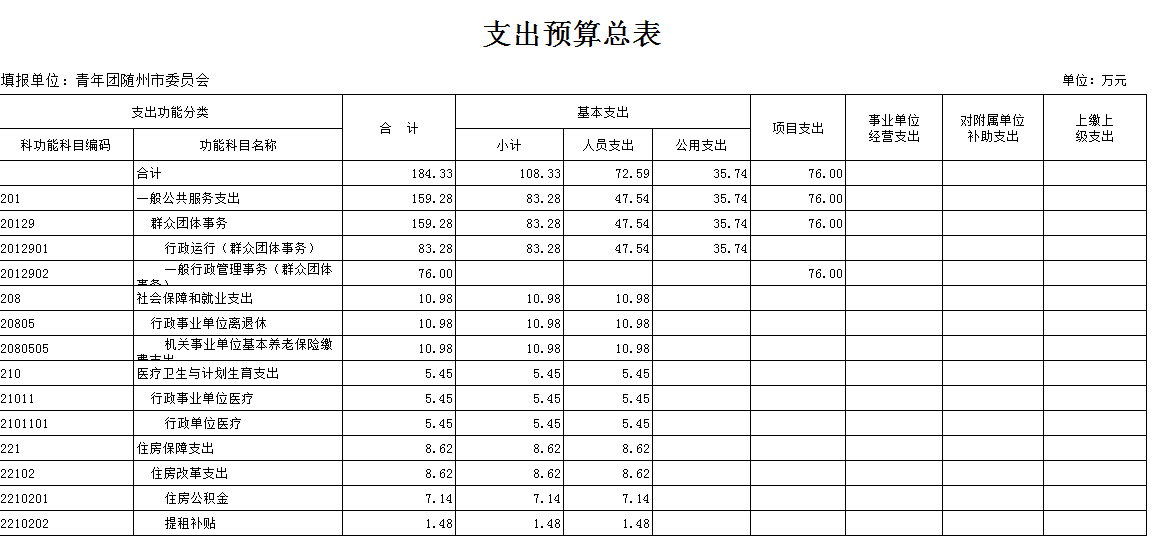 2018年財政預算安排支出184.33萬元,其中:一般公共服務支出159.28萬元,醫療衛生支出5.45萬元,住房保障支出862萬元。比上年減少4.64萬元,減少2.7%。主要原因為單位加強經費支出管理等原因。