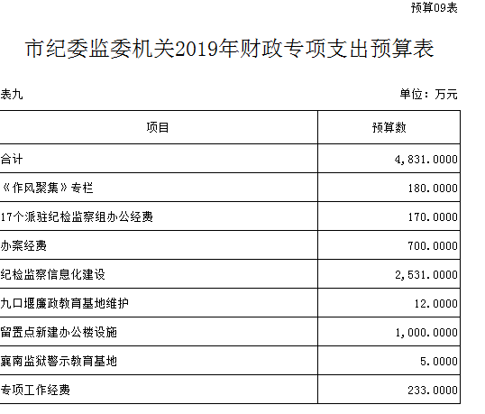 系統匯總:2019年市紀委監委財政撥款預算總支出6467.59萬元,較上年增加4085.21萬元,增加比例為171.48%,主要原因是紀檢監察信息化建設及留置點新建辦公樓設施,專項設施預算增加。