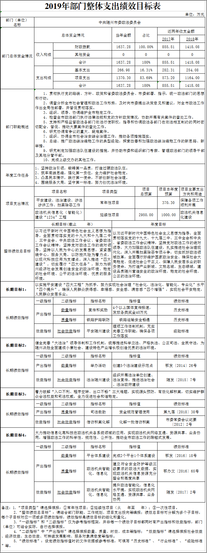 部門整體績效目標編制,基本支出主要用于保障機關(guān)干部工資性支出以及機關(guān)運行經(jīng)費支出,項目支出主要是平安建設(shè)、法治建設(shè)及政法機關(guān)智能化建設(shè)等項目支出,包括涉法涉訴、鐵路護路聯(lián)防、社會管理創(chuàng)新、醫(yī)患糾紛調(diào)處、見義勇為、法治隨州建設(shè)、政法信息化建設(shè)、掃黑除惡等內(nèi)容。產(chǎn)出指標中數(shù)量指標主要依據(jù)上級對機關(guān)政法工作的量化考核指標設(shè)置,效益指標主要是指社會效益指標,依據(jù)該項工作完成情況及帶來社會效益、群眾滿意度等方面的情況綜合量化考核。