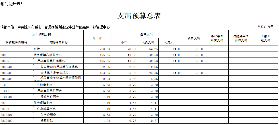 1、隨州市委老干部局(含隨州市企事業單位離休干部管理服務中心)2019年支出預算總額為208.33萬元,按支出項目經濟類別劃分:工資福利支出61.59萬元,占支出預算總額的29.6%,商品和服務支出14.08萬元,占支出預算總額的7%,項目支出130萬元,占支出預算總額的62.4%。按支出功能科目劃分:社會保障和就業支出195.35萬元,占支出預算總額的93.8%,衛生健康支出5.88萬元,占支出預算總額的2.8%,住房保障支出7.1萬元,占支出預算總額的3.4%。較上年預算安排增加78.19萬元,增加60.1%。增加原因為項目經費中的110萬上年作為財政社保科的預算,今年直接在市委老干部局預算中編制,導致預算增加。