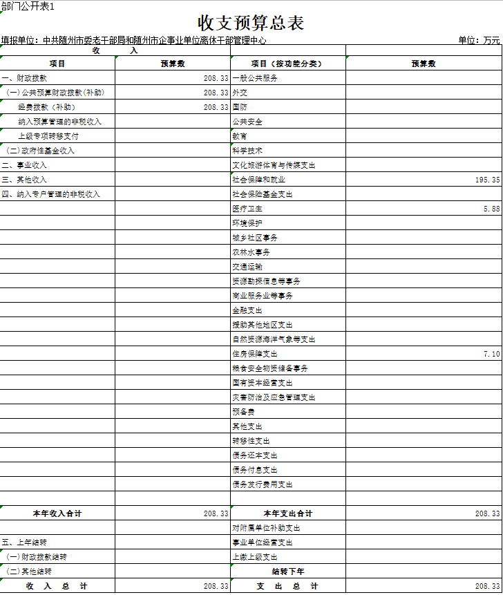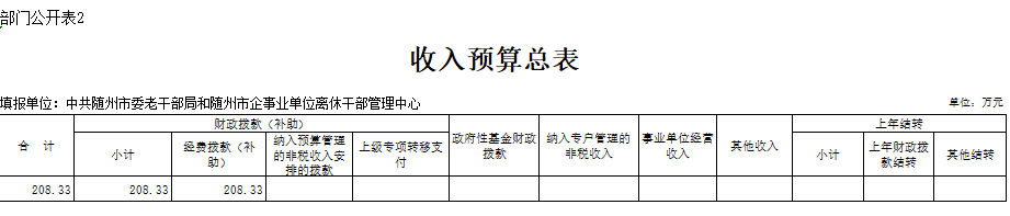 1、隨州市委老干部局(含隨州市企事業單位離休干部管理服務中心)2019年收入預算總額為208.33萬元,全部為財政撥款(補助)收入。較上年預算安排增加78.19萬元,增加60.1%,增加原因主要為本年度項目經費中的110萬上年作為財政社保科的預算,今年直接在市委老干局預算中編制,導致預算增加。