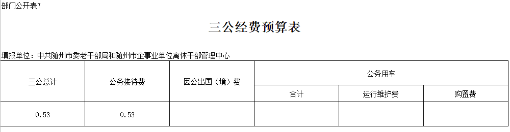1、隨州市委老干部局(含隨州市企事業單位離休干部管理服務中心)2019年“三公”經費年初預算安排0.53萬元,與上年相比增加0.08萬元,增幅17%。其中: