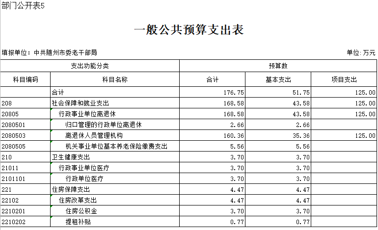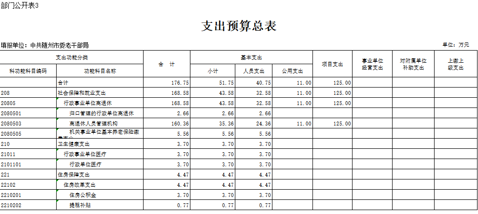 2、隨州市委老干部局(機關)2019年財政撥款支出預算176.75萬元,較去年增加99.22萬元,增加128%。增加原因主要為本年度的125萬元的項目經費中的110萬上年作為財政社保科的預算,今年直接在市委老干部局預算中編制,導致預算增加。