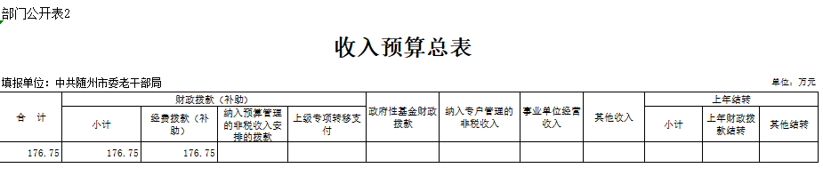 2、隨州市委老干部局(機關)2019年收入預算總額為176.75萬元,全部為財政撥款(補助)收入。較上年預算安排增加86.98萬元,增加96.9%,增加原因主要為本年度的125萬元的項目經費中的110萬上年作為財政社保科的預算,今年直接在市委老干部局預算中編制,導致預算增加。