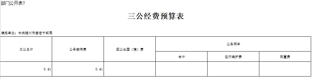 2、隨州市委老干部局(機關)2019年“三公”經費年初預算安排0.41萬元,與上年相比增加0.11萬元,增幅36%。其中: