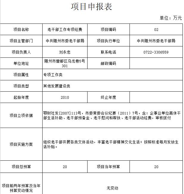 1、隨州市委老干部局(含隨州市企事業單位離休干部管理服務中心)2019年財政撥款支出預算208.33萬元,較去年增加78.19萬元,增加60.1%。增加原因主要為本年度的125萬元的項目經費中的110萬上年作為財政社保科的預算,今年直接在市委老干部局預算中編制,導致預算增加。
