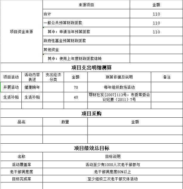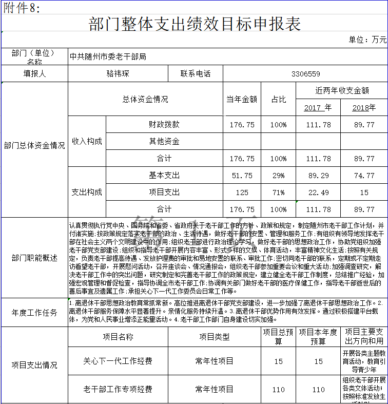 2、部門基本情況:內設辦公室和服務科,行政編制5人,實有人員4人,退休人員3人。2019年的主要工作:一是離退休干部思想政治教育常抓常新。以開展離退休干部黨員“兩學一做”學習教育為契機,在離退休干部黨員中廣泛開展“兩學一做”學習教育。高位推進離退休干部黨支部建設,進一步加強了離退休干部思想政治工作。通過一系列形式多樣的活動,及時了解掌握離退休干部的思想狀況,在思想上政治上關心愛護老干部,理順老干部的思想情緒,老干部隊伍和諧穩定,精神面貌健康向上。二是離退休干部服務保障水平顯著提升。親情化服務持續升溫,定期發放學習資料。在老干部的精神文化生活方面,老干部局組織開展了一系列主題紀念活動,積極展示老干部愛國愛黨、健康向上的精神面貌。在困難幫扶方面則是繼續鞏固和完善離退休干部困難幫扶制度,市級預留幫扶資金25萬元,加大對有特殊困難的離退休干部的關心照顧,幫助他們解決實際困難。三是離退休干部優勢作用有效發揮。通過積極搭建平臺載體,堅持不懈地開展以“展示陽光心態、體驗美好生活、暢談發展變化”為主要內容的為黨和人民事業增添正能量活動。全面升級離退休干部“牽手”活動,進一步擴大牽手范圍。拓寬活動領域,活動影響力不斷擴大。以“講好中國故事、建設中心城市”為主題,動員組織老干部進學校、進黨校、進機關、進社區,講歷史,講人文、講成長、講發展,服務市委、市政府中心工作大局。關心下一代工作全面推進,進一步建立和完善關工委組織,開展特色活動,引導廣大青少年深入了解歷史,樹立正確的世界觀、人生觀和價值觀,讓黨的優良傳統和作風代代相傳。四是老干部工作部門自身建設切實加強。以“兩學一做”學習教育為抓手,持之以恒抓好老干部工作部門自身建設,促進老干部工作者增強大局意識,拓寬工作視野,錘煉過硬作風,提高業務水平。學習傳達3號文件精神,思想上再聚力,扎實開展機關黨員干部“兩學一做”學習教育,作風上再鼓勁,繼續重視老干部工作信息宣傳,輿論上再造勢。