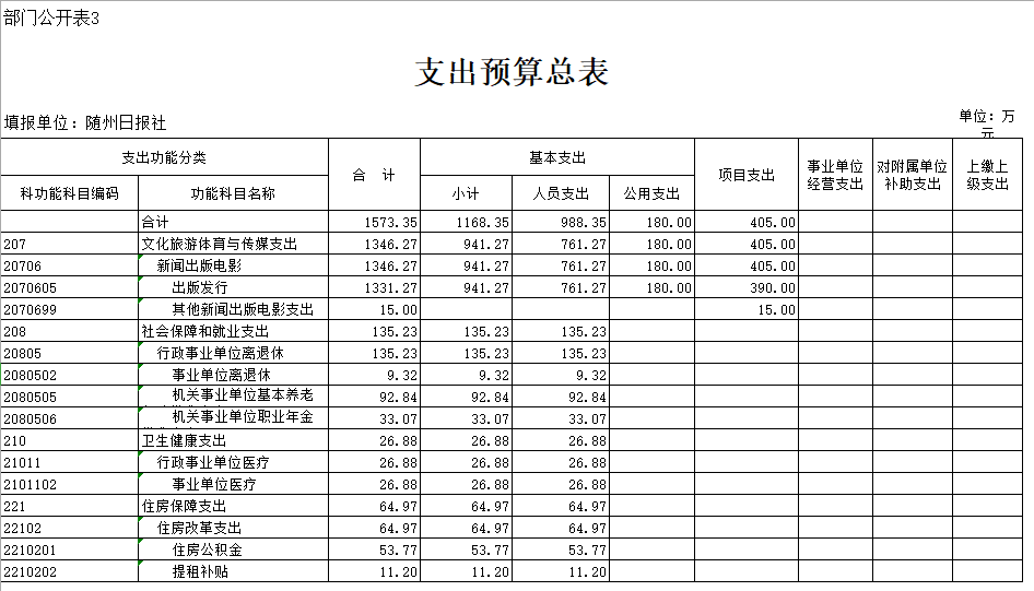 2019年隨州日報社支出預算總額為1573.35萬元,比上年減少76.84萬元,下降4.7%,按經濟分類工資福利性支出979.03萬元;對個人和家庭補助支出9.32萬元;商品與服務支出180萬元;其他資本性支出405萬元。按功能分類文化體育與傳媒預算支出1346.27萬元,社會保障和就業預算支出135.23萬元,醫療衛生預算支出26.88萬元,住房保障支出預算64.97萬元。減少主要原因為2018年單位搬家已完畢,2019年商品與服務支出相比去年減少較多。