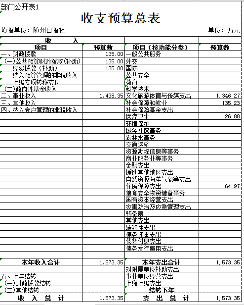 2019年隨州日報社收入預算總額為1573.35萬元,比上年減少76.84萬元,下降4.7%,其中財政撥款135萬元與去年相同,事業單位經營收入1438.35萬元比去年減少76.84萬元。減少主要原因為附屬子公司經營狀況受限,上交任務款延后。