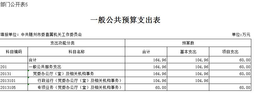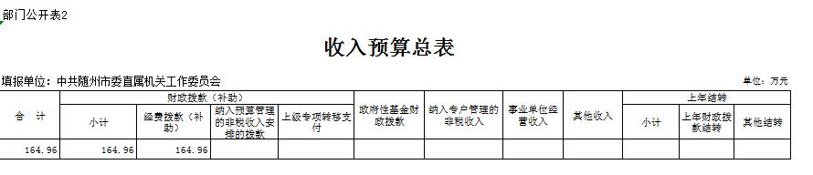 中共隨州市委直屬機關工作委員會預計財政撥款支出164.96萬元。新成立單位,無上年對比。
