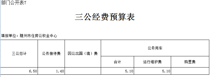 2020年隨州市住房公積金中心“三公”經費年初預算安排6.50萬元,比上年減少2.53萬元、減少28.02%,主要原因是減少了公務用車運行維護費的支出。