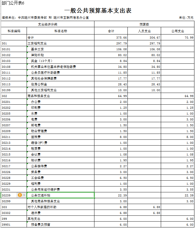 6.行政運行:反映用于宣傳部門保障機構正常運行的經費。