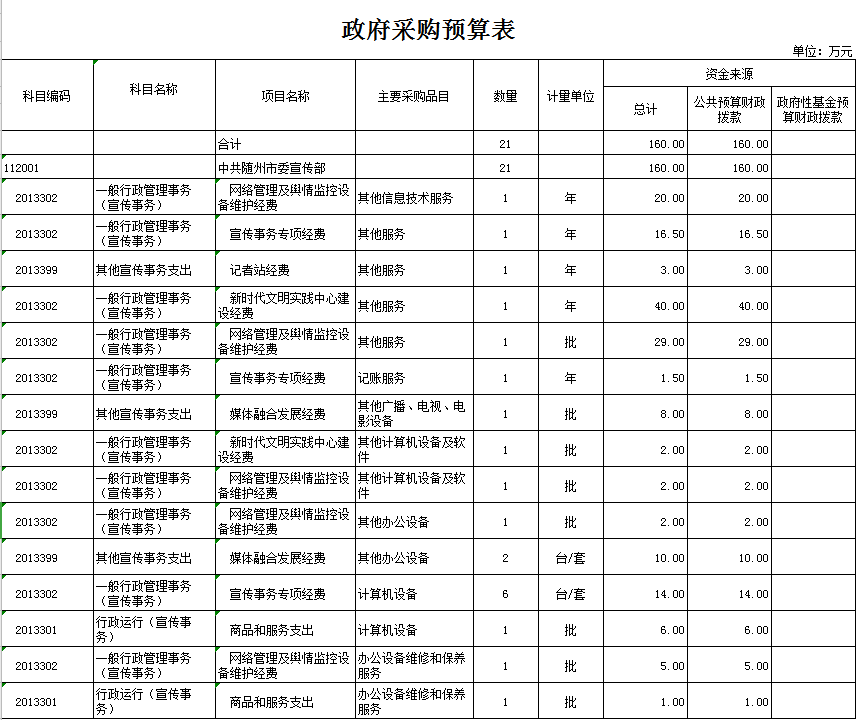 2020年市委宣傳部政府采購總額預算160萬元,包括購置資產44萬元,購買服務116萬元,較2019年26萬元大幅度增加,同比增長515%。增加原因:2020年按照政府采購的要求將預算的車輛維修、咨詢服務、委托業務費等各項服務費均納入到政府采購中,相比2019年擴大了政府采購范圍;2020計劃更換國產辦公設備。