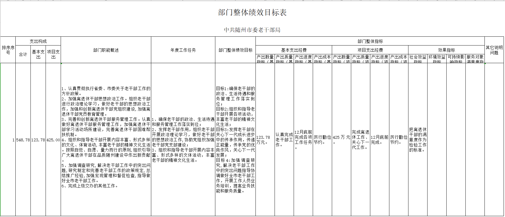 ??2、部門基本情況:內設辦公室和服務科、活動科、調研科,行政編制10人,實有人員10人,退休人員2人。市委老干部局下設二級單位:隨州市企事業單位離休干部管理服務中心(參公事業單位)。2020年的主要工作:一是離退休干部思想政治教育常抓常新。以開展離退休干部黨員“兩學一做”學習教育為契機,在離退休干部黨員中廣泛開展“兩學一做”學習教育。高位推進離退休干部黨支部建設,進一步加強了離退休干部思想政治工作。通過一系列形式多樣的活動,及時了解掌握離退休干部的思想狀況,在思想上政治上關心愛護老干部,理順老干部的思想情緒,老干部隊伍和諧穩定,精神面貌健康向上。二是離退休干部服務保障水平顯著提升。親情化服務持續升溫,定期發放學習資料。在老干部的精神文化生活方面,老干部局組織開展了一系列主題紀念活動,積極展示老干部愛國愛黨、健康向上的精神面貌。在困難幫扶方面則是繼續鞏固和完善離退休干部困難幫扶制度,市級預留幫扶資金25萬元,加大對有特殊困難的離退休干部的關心照顧,幫助他們解決實際困難。三是離退休干部優勢作用有效發揮。通過積極搭建平臺載體,堅持不懈地開展以“展示陽光心態、體驗美好生活、暢談發展變化”為主要內容的為黨和人民事業增添正能量活動。全面升級離退休干部“牽手”活動,進一步擴大牽手范圍。拓寬活動領域,活動影響力不斷擴大。以“講好中國故事、建設中心城市”為主題,動員組織老干部進學校、進黨校、進機關、進社區,講歷史,講人文、講成長、講發展,服務市委、市政府中心工作大局。關心下一代工作全面推進,進一步建立和完善關工委組織,開展特色活動,引導廣大青少年深入了解歷史,樹立正確的世界觀、人生觀和價值觀,讓黨的優良傳統和作風代代相傳。四是老干部工作部門自身建設切實加強。以“兩學一做”學習教育為抓手,持之以恒抓好老干部工作部門自身建設,促進老干部工作者增強大局意識,拓寬工作視野,錘煉過硬作風,提高業務水平。學習傳達3號文件精神,思想上再聚力,扎實開展機關黨員干部“兩學一做”學習教育,作風上再鼓勁,繼續重視老干部工作信息宣傳,輿論上再造勢。