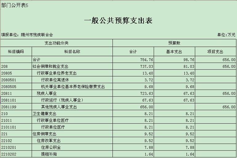 2210201 住房保障支出(類)住房改革支出(款)住房公積金(項):指隨州市殘疾人聯(lián)合會按照人力資源和社會保障部、財政部規(guī)定的基本工資和津貼補貼以及規(guī)定比例為職工繳納的住房公積金。