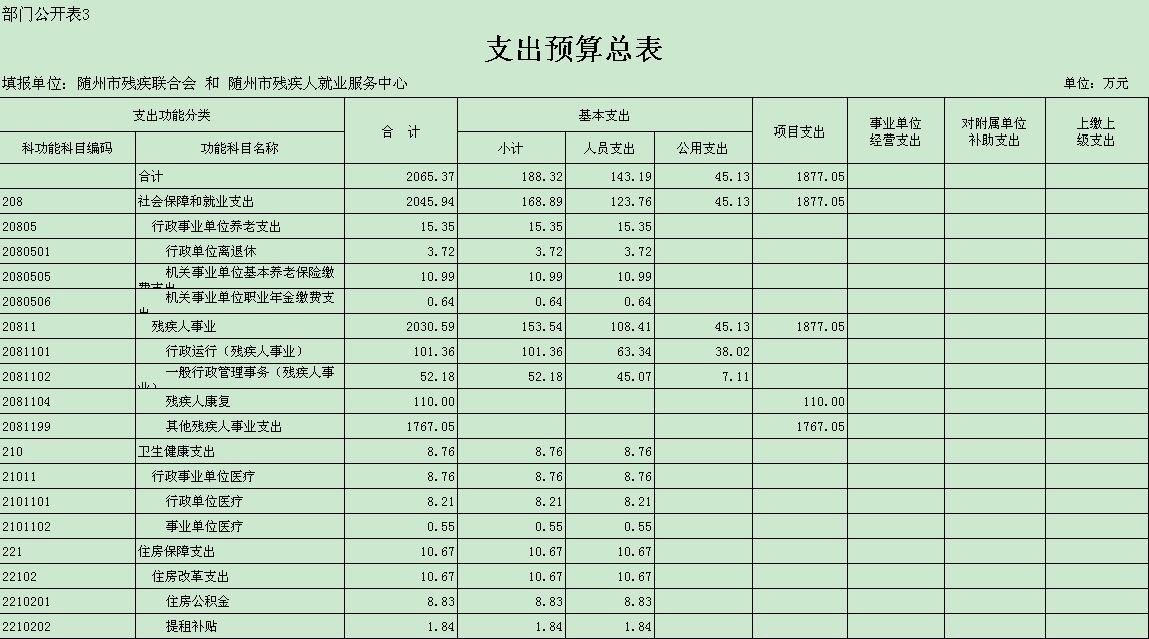 2081101 社會保障和就業(yè)支出(類)殘疾人事業(yè)(款)行政運行(項):指隨州市殘疾人聯(lián)合會的基本支出。
