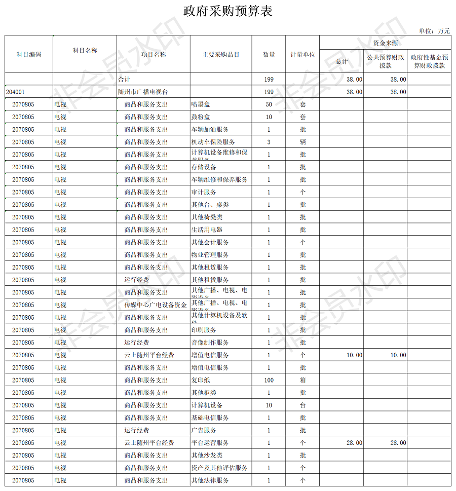 ?隨州廣播電視臺2020年系統及本級政府采購預算總額為93萬元,其中隨州廣播電視臺本級38萬元,隨州市電視調頻發射臺25萬元,隨州市中波實驗臺30萬元。政府采購貨物預算10萬元,服務預算73萬元,工程預算10萬元,較上年預算安排(1408.1萬元)減少1315.1元,減少93.4%,原因是減少了傳媒中心廣電設備購置的政府采購預算。其中,隨州廣播電視臺本級較上年預算安排(1379.5萬元)減少1341.5萬元,減少97.24%,原因是減少了傳媒中心廣電設備購置的政府采購預算。?