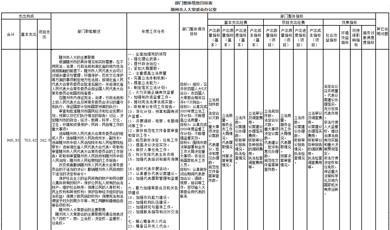 為服務和保障隨州市人大及其常委會依法履行職責,隨州市人民代表大會下設法制委員會、財政經濟委員會、教育科學文化衛生委員會、城鄉建設與環境資源保護委員會、社會建設委員會,隨州市人民代表大會常務委員會下設辦公室(研究室)和代表選舉和人事任免工作委員會、農村工作委員會、預算工作委員會、法制工作委員會等10個正處級機構。辦公室內設秘書科、綜合科、老干部科、機關事務科、政工人事科、立法科、備案審查科、信訪科、預算審查科。目前,行政干部33,行政工人2人,聘用人員7人,離休1人,退休30人(人數為2020年預算要求申報時間)。
