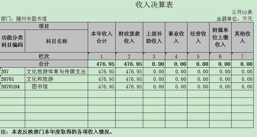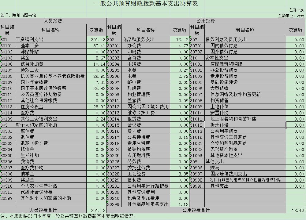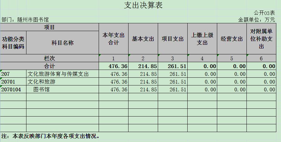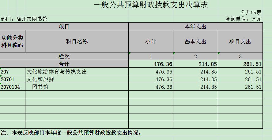 2020年度收入支出總決算476.95萬元;(1)收入總計476.95萬元,其中財政撥款收入476.95萬元;(2)支出總計476.35萬元。文化體育與傳媒支出476.35萬元,主要用于隨州市圖書館開展公益文化活動、保障圖書館事業發展而發生的項目支出和為保證日常運轉發生的支出;(3)隨州市圖書館2020年財政撥款收入476.95萬元,支出476.36萬元,其中一般公共預算財政撥款476.36萬元;(4)隨州市圖書館2020年度一般公共預算基本支出214.85萬元,項目支出261.51萬元。