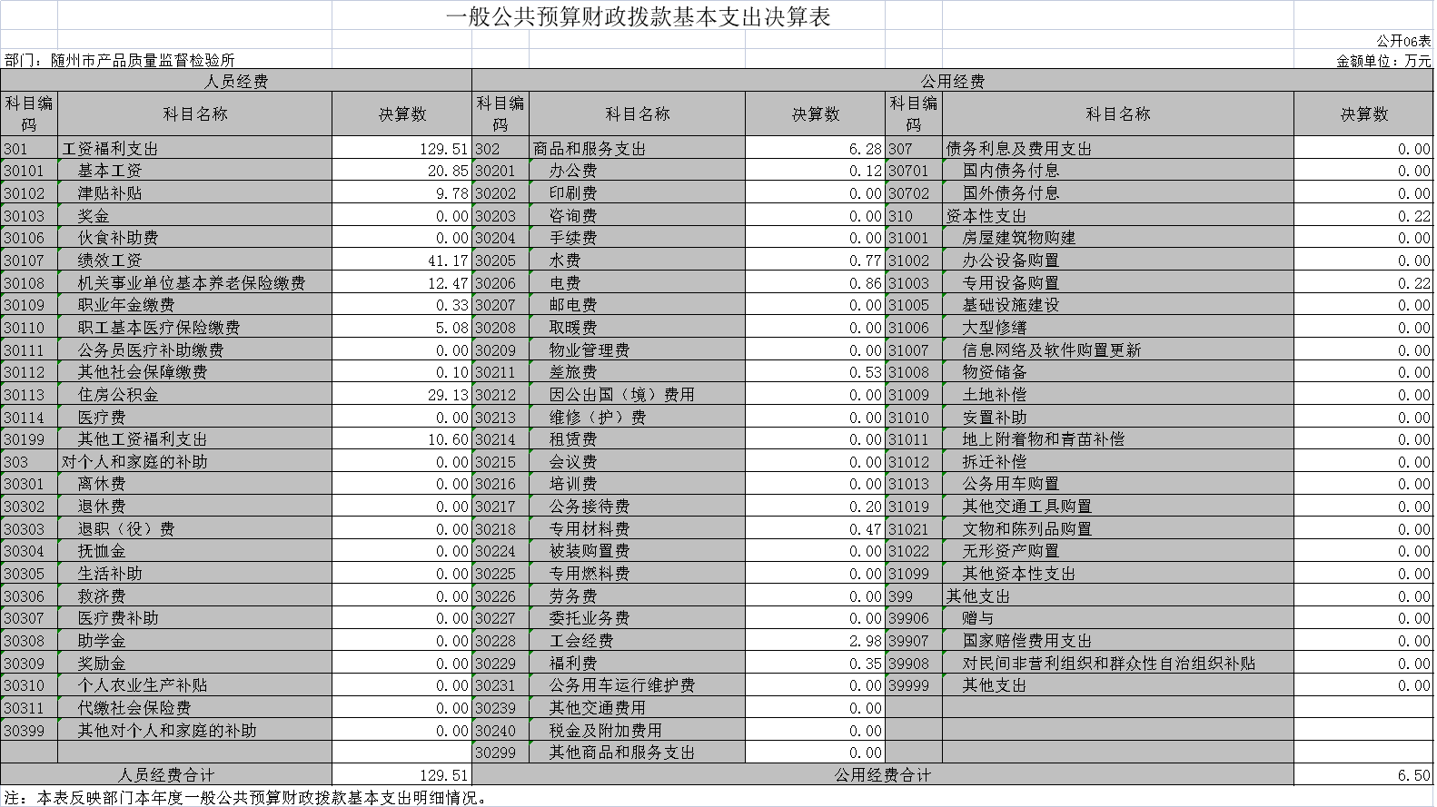 六、一般公共預算財政撥款基本支出決算表(公開表06表)