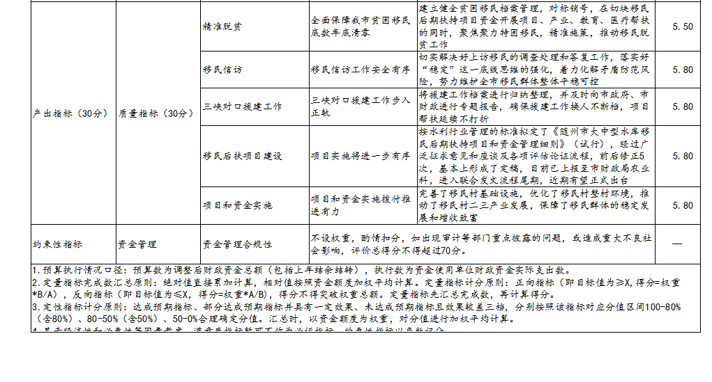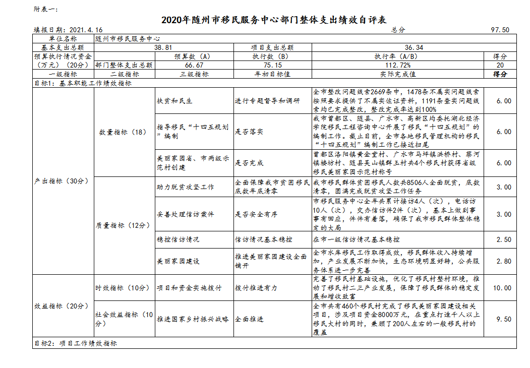 根據《2020年隨州市移民服務中心部門整體支出績效自評表》中績效目標完成情況評分,隨州市移民服務中心2020年部門整體績效評價得分97.5分,評價等級為:優。