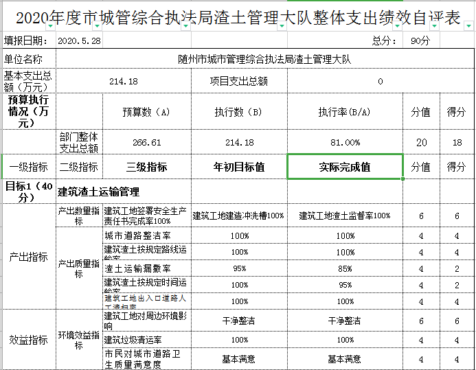 組織開(kāi)展部門(mén)整體支出績(jī)效評(píng)價(jià),評(píng)價(jià)情況來(lái)看,2020年度市城管綜合執(zhí)法局規(guī)劃分局整體績(jī)效自評(píng)得分90分,績(jī)效評(píng)價(jià)等級(jí)為:良好;其中,預(yù)算執(zhí)行情況得分18分,年度績(jī)效目標(biāo)得分72分。