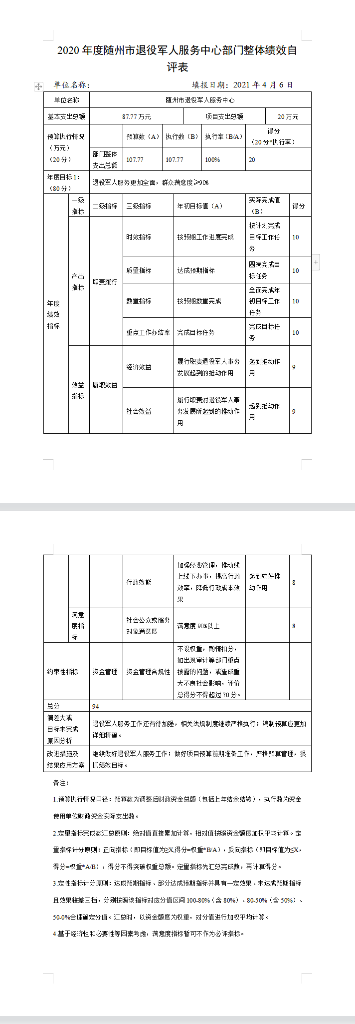 ????根據《2020年市直部門整體支出績效自評表》中績效指標分析評分,隨州市退役軍人服務中心2020年部門整體支出績效自評得96分,績效等級為優(yōu)。?????????????