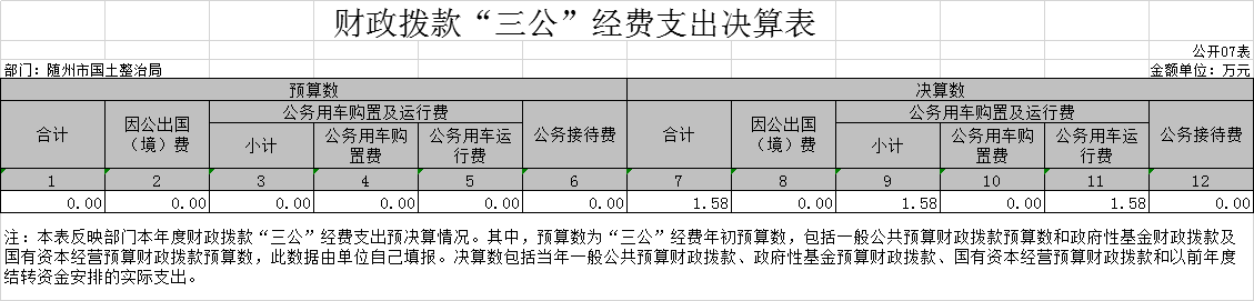 隨州市國土整治局2020年度一般公共預算財政撥款“三公”經費支出年初預算數為2.85萬元,決算數為1.58萬元,完成預算的55.44%,決算數較上年的2.27萬元減少30.4%,主要原因是疫情影響,“三公”經費支出減少。其中: