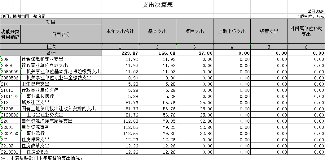 隨州市國土整治局2020年度支出總計223.87萬元,較上年193.22萬元增加15.86%,主要原因是增加了項目支出。