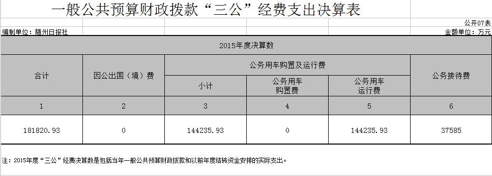 2015年,隨州日報社“三公”經費合計支出 189820.93元,其中:公務用車運行維護費152235.93元,公務接待費37585元,無因公出國(境)費用。“三公”經費總支出比2014年降低26.5%。 2015年單位公務車保有3輛,未新購置公務車輛。2015年公務接待費37585元(含酒水),接待32批次,312人次。