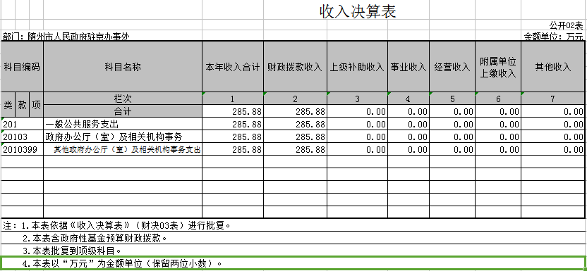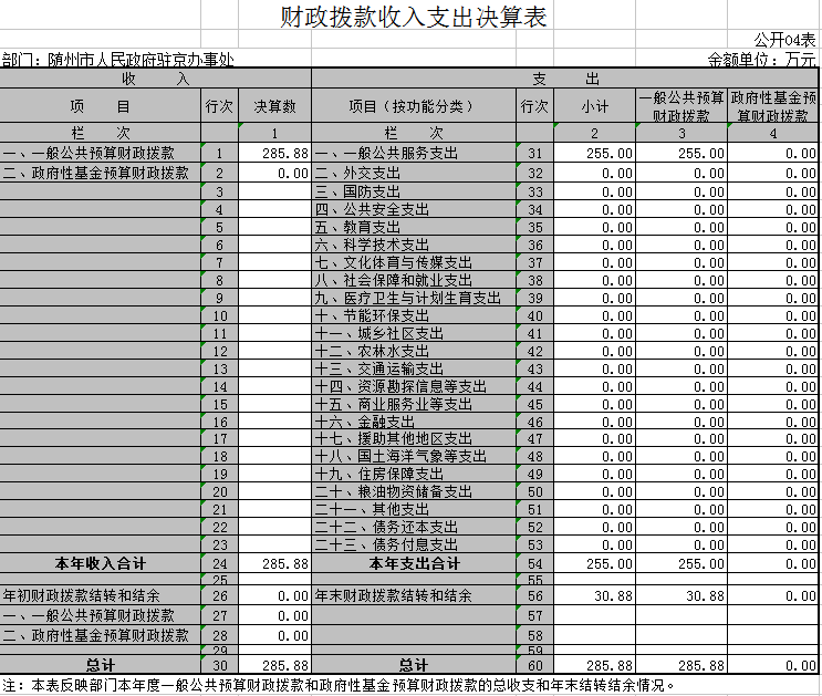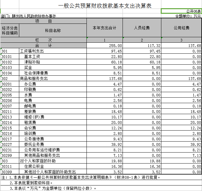 市駐京辦屬全額撥款單位,人員經費按現在人員由財政全額保障,本年度收入285.88萬元,上年度結轉無,總支出255萬元,年末結轉和結余30.88萬元。