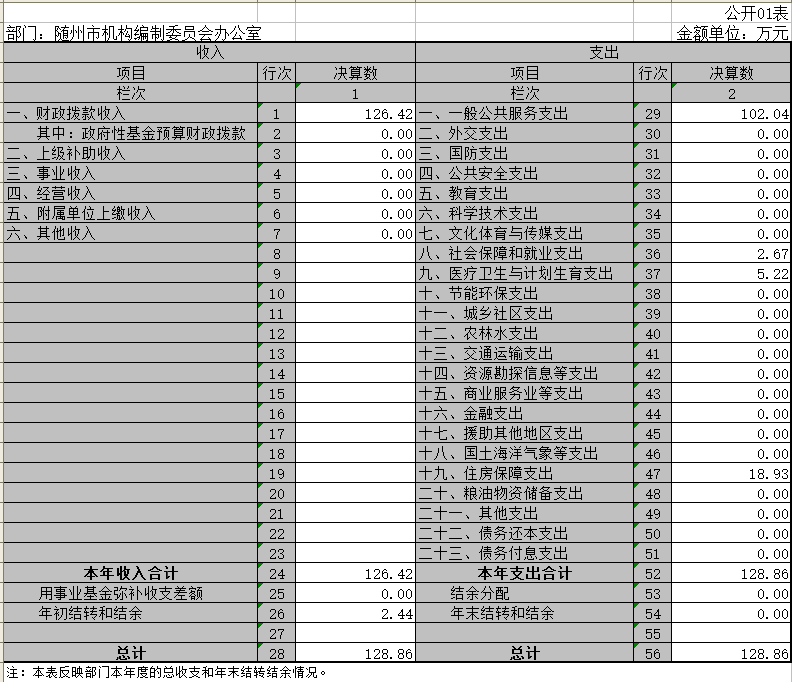 2015年決算收入合計128.86萬元,其中財政撥款收入 126.42萬元,上年結(jié)轉(zhuǎn)和結(jié)余2.44萬元。決算支出合計126.41萬元。其中人員經(jīng)費支出100.45元,日常公用經(jīng)費支出25.96萬元,