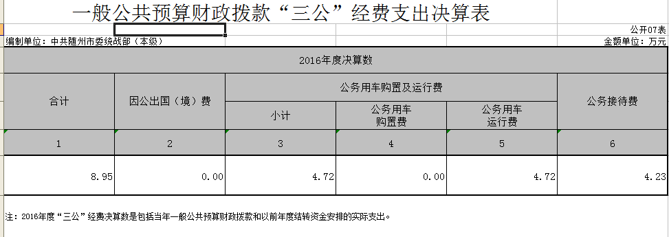 中共隨州市委統戰部2016年度“三公”經費總支出8.95萬元,比上年度有所減少:2016年,我部國內公務接待批次42批次,接待人數352人次。
