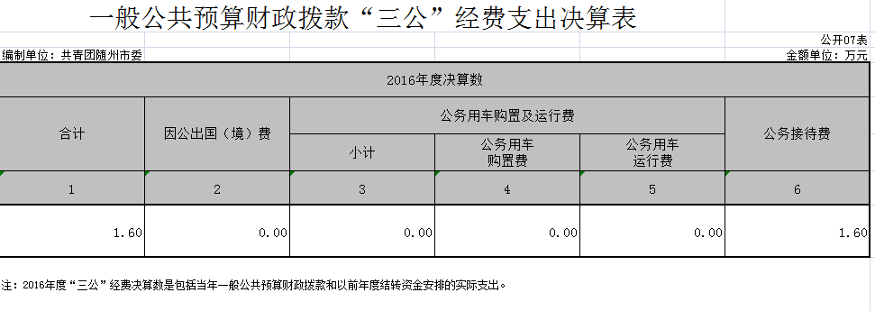 2016年團市委認真貫徹落實中央八項規定和省委、省政府、市委、市政府關于厲行節約的要求,進一步從嚴控制“三公”經費開支。“三公”經費總支出1.6萬元,比上年度減少4.85萬元。“三公”經費開支具體明細如下: