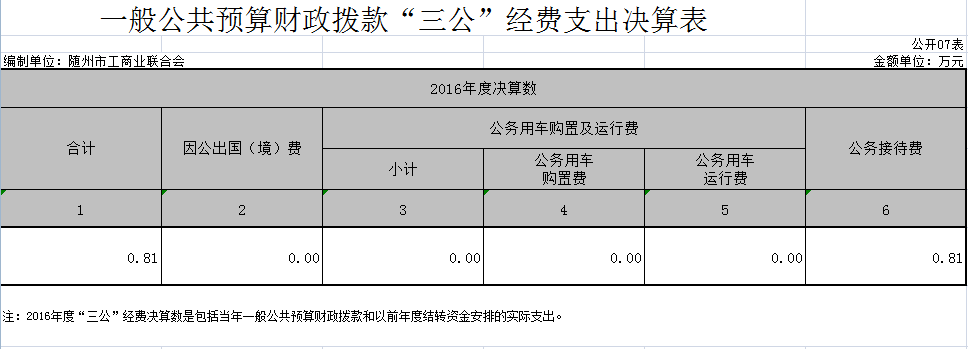 隨州市工商聯2016年度“三公”經費總支出0.81萬元,較去年減少11.66萬元,因無因公出國費用,且未保留公務用車。“三公”經費開支具體明細如下: