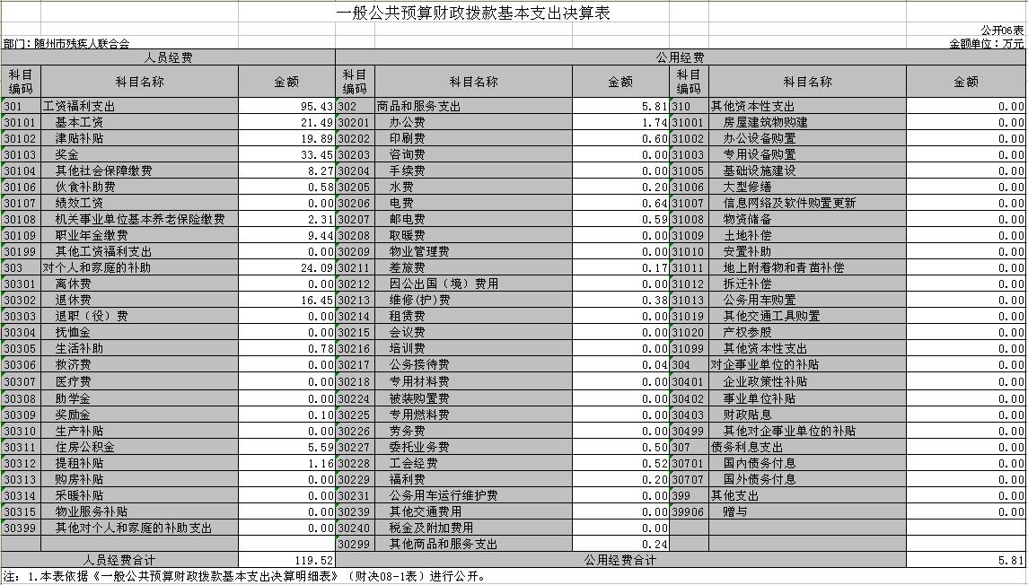隨州市殘聯(lián)2017年度部門決算共包含本級(jí)決算和下屬單位共2家:其中行政單位1家,事業(yè)單位1家。市殘聯(lián)機(jī)關(guān)現(xiàn)有在編人員5人:參公人員5人(正處級(jí)1人,副處級(jí)3人,副科級(jí)1人),退休人員4人(正處級(jí)2人,副處級(jí)2人);下屬單位(殘疾人就業(yè)服務(wù)中心)在職人員5人,其中全額事業(yè)編1人,以錢養(yǎng)事人員4人,自聘人員1人。