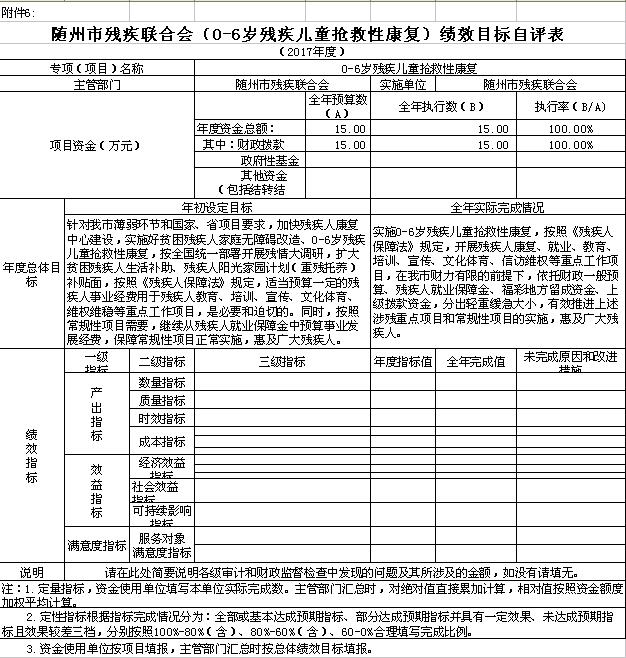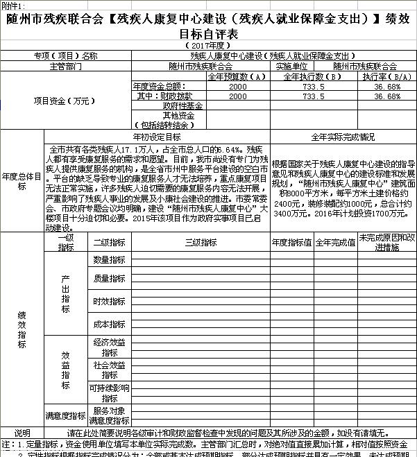 根據(jù)預(yù)算績(jī)效管理要求, 2017年我單位預(yù)算項(xiàng)目6個(gè),項(xiàng)目名稱分別為:殘疾人康復(fù)中心建設(shè)(殘疾人就業(yè)保障金支出)、其他殘疾人事業(yè)支出(含延續(xù)項(xiàng)目)、其他殘疾人事業(yè)支出、特困殘疾人生活救助、陽(yáng)光家園(托養(yǎng)服務(wù))、0-6歲殘疾兒童搶救性康復(fù)。2017年項(xiàng)目預(yù)算數(shù)共計(jì)2072.28萬(wàn)元,收入完成數(shù)共計(jì)851.78萬(wàn)元(其中撥付殘疾人康復(fù)中心600萬(wàn)元;市殘疾人就業(yè)服務(wù)中心60萬(wàn)元;高新區(qū)殘聯(lián)20萬(wàn)元。)
