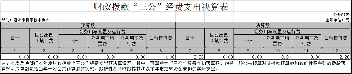 2017年隨州市科協(xié)“三公”經(jīng)費(fèi)合計(jì)2.26萬元,比上年的2.51萬元減少了0.25萬元。公務(wù)接待費(fèi)2.26萬元,比上年減少0.25萬元,同比降低9.96%,主要是因?yàn)閱挝粐?yán)格公務(wù)接待支出制度,盡量壓縮公務(wù)接待支出。全年公務(wù)接待累計(jì)接待約7批次,接待人數(shù)約30人次。2017年無公務(wù)用車購置費(fèi)、無公務(wù)用車運(yùn)行維護(hù)費(fèi)、無因公出國費(fèi)用,。