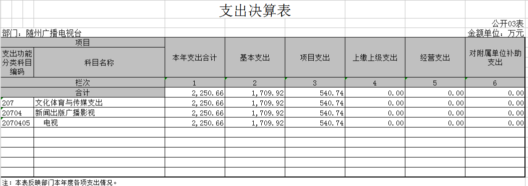 隨州廣播電視臺(本級)2017年支出合計2250.66萬元,較上年增加597萬元,增長36%,主要是人員支出和《魅力中國城》等突發性項目的增加,和2017年預算(2384.81萬元)相比減少134.15萬元,減少5.6%,其中基本支出1709.92萬元,項目支出540.74萬元。