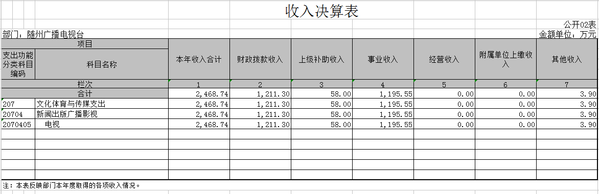隨州廣播電視臺(本級)2017年收入合計2468.74萬元,較上年增加1291.99萬元,增加109.79%(因隨州廣播電視臺2017年正式列入財政部門預算),和2017年預算(2229.23萬元)相比增加了239.51萬元,增加10.74%,其中財政撥款1211.3萬元,較上年增加671.26萬元,增加124.3%,和2017年預算(617.8萬元)相比增加了593.5萬元,增長96%,主要是人員經費撥款和《魅力中國城》等突發性項目的增加,上級補助收入58萬元,事業收入1195.55萬元,其他收入3.9萬元。