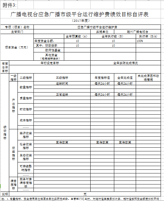 (3)應急廣播市級平臺運行維護費10萬元,用于支付應急廣播的網絡運行費用、設備維護費用等。年初制度績效目標為完成市級平臺建設,全天24小時不間斷播出,充分發揮應急廣播的輿論導向和應急響應作用,至2017年底,已完成績效目標任務。