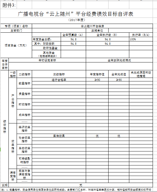 (4)云上隨州平臺經費94.8萬元,其中上交省帶寬租用費38萬元,設備購置和維護費用56.8萬元。年初績效目標為完成平臺搭建,充分發揮平臺的新聞宣傳和政務服務功能,2017年底,我臺已完成平臺建設,并正常運行和維護,完成績效目標任務。