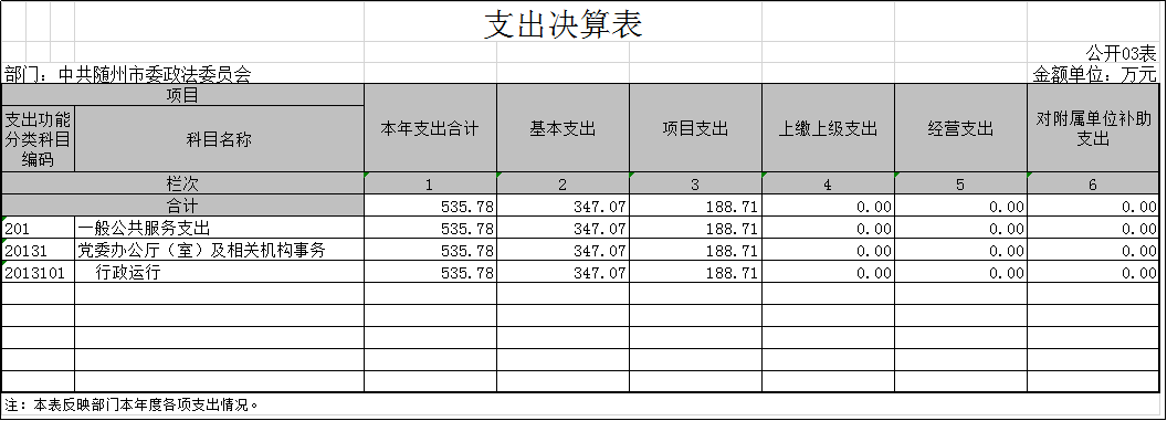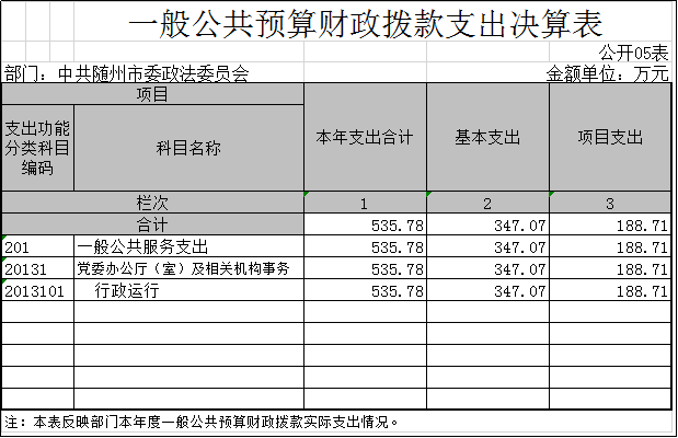 2017年度市委政法部門整體支出績效評價自評得分為 90分,績效等級為優。2017年單位全年預算數收入829.87萬元,實際支出535.78萬元,完成預算64.56%。取得的主要成效:保障機構正常運轉和年度工作任務完成,為隨州建設經濟轉型升級和創新驅動示范城市、打造特色產業增長極提供了優良的法治環境。存在的主要問題:項目年度預算執行率偏低。其主要原因:一方面,我單位在支出過程中厲行節約,壓縮開支;另一方面,由于項目費用大部分用于保障基層基礎建設,項目建設周期長且具有延續性,使得部分項目支出當年不能全部完成,故預算執行率偏低。下一步改進措施:及時調整優化后續項目及下年度預算支出的方向和結構,進一步加強財務管理,規范資金使用,提高年度預算執行率,特別是大力提高年度項目預算經費的執行率。
