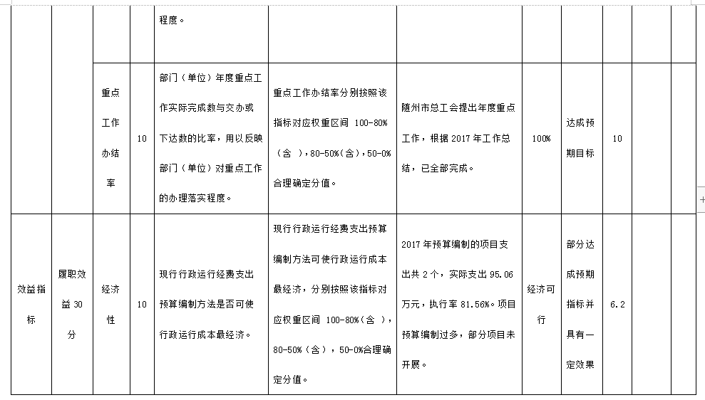 ??根據市總工會工作職責的特殊性,一些工作是無法用具體量化指標來衡量,我們結合實際情況,根據各部門履行職責而實際完成的工作情