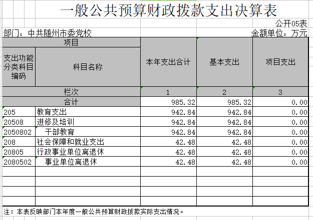 2017年度一般公共財政撥款支出985.32萬元,其中教育支出942.84萬元,占一般公共財政撥款支出的95.69%;社會保障和就業支出42.48萬元,占一般公共財政撥款支出的4.31%。財政撥款決算支出比年初支出預算的3804.71萬元少2819.39萬元,主要原因是市委黨校新校園尚未建設好,“新校區教學設備購置”的2500萬元項目支出經費市財政未下達。