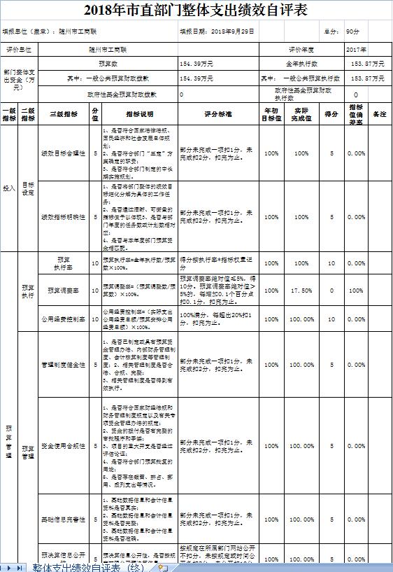 1、預(yù)算績(jī)效管理工作開展情況。根據(jù)預(yù)算績(jī)效管理要求,我單位組織開展了2017年度單位整體支出績(jī)效評(píng)價(jià)和2017年度一般公共預(yù)算項(xiàng)目支出全面開展績(jī)效自評(píng)。根據(jù)《市財(cái)政局關(guān)于2018年開展財(cái)政支出績(jī)效評(píng)價(jià)工作的通知》(隨財(cái)發(fā)〔2018〕16號(hào))文件,并積極同市財(cái)政局銜接,我會(huì)確定了自評(píng)的項(xiàng)目,安排專人開展自評(píng)工作,認(rèn)真填寫自評(píng)表,撰寫形成自評(píng)報(bào)告。